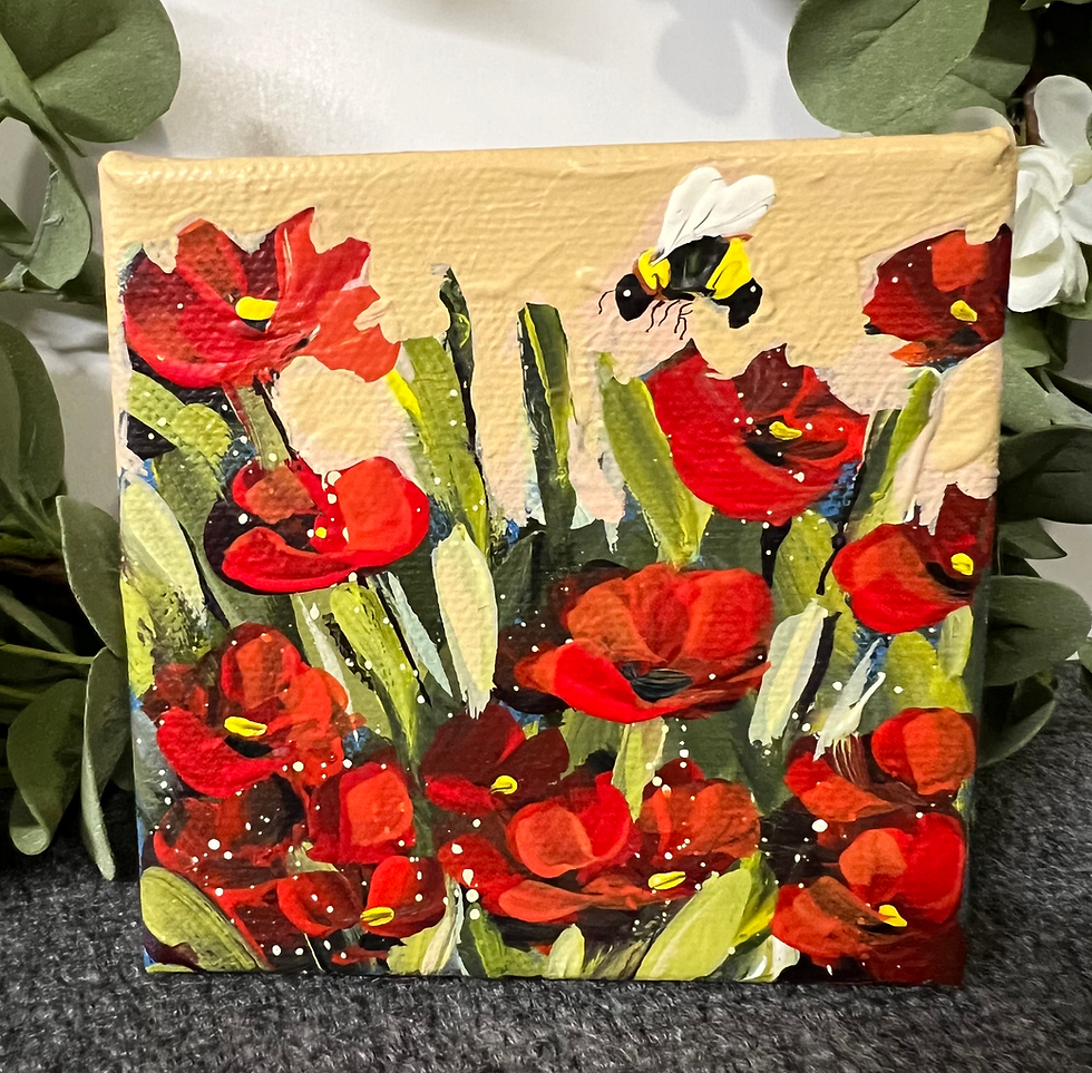 “Poppies & Buzz the Bee on Wood #1” 5” x 5”